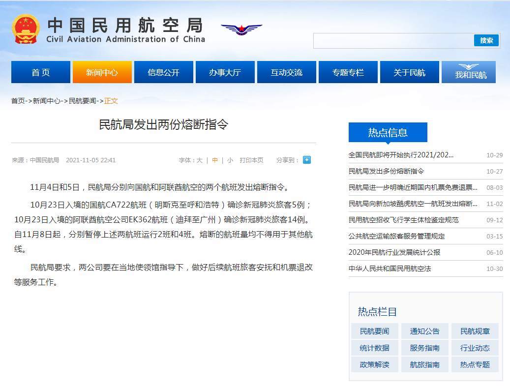 11月4日和5日,民航局分别向国航和阿联酋航空的两个航班发出熔断指令。