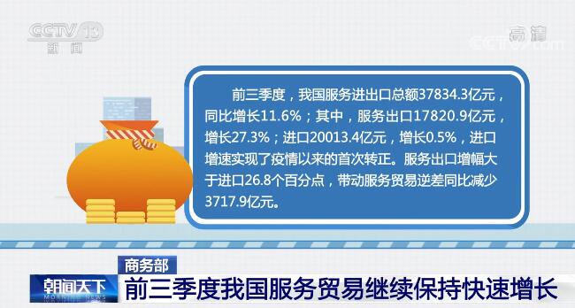 央视网消息:商务部昨天(11月5日)发布的数据显示,今年的前三季度,我国服务进出口总额37834.3亿元,同比增长11.6%,我国服务贸易继续保持快速增长态势。