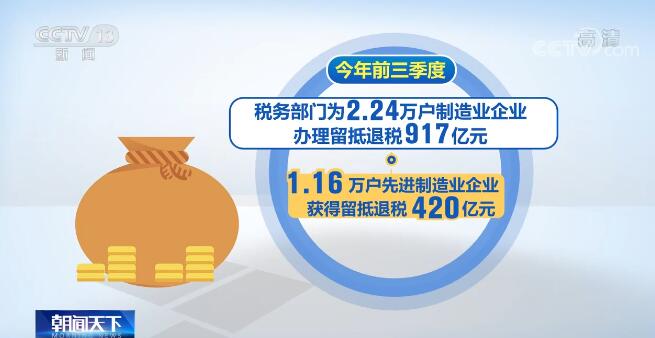王道树表示,除了对制造业中小微企业实施阶段性税收缓缴政策,税务部门还对先进制造业企业按月全额退还增值税增量留抵税额,对其他制造业退还60%增量留抵税额。今年前三季度,税务部门为2.24万户制造业企业办理留抵退税917亿元,其中1.16万户先进制造业企业获得留抵退税420亿元,进一步支持制造业发展。