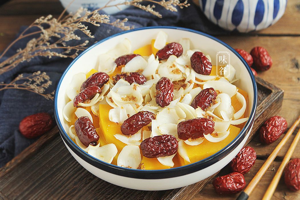 【材料】:南瓜 400g、新鲜百合 40g、红枣 6个、桂花蜜 适量
