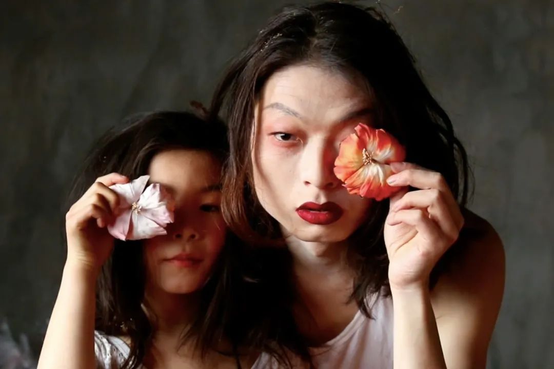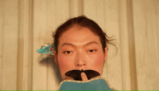 性别界限的模糊已经不稀奇,很多时候他的灵感是跨越了所有界限的——他把脸涂白,眼角涂红,戴上假刘海,在深夜里模仿阴森恐怖的纸扎人;或是在浑身上下扑满面粉,成为一尊石膏雕塑。