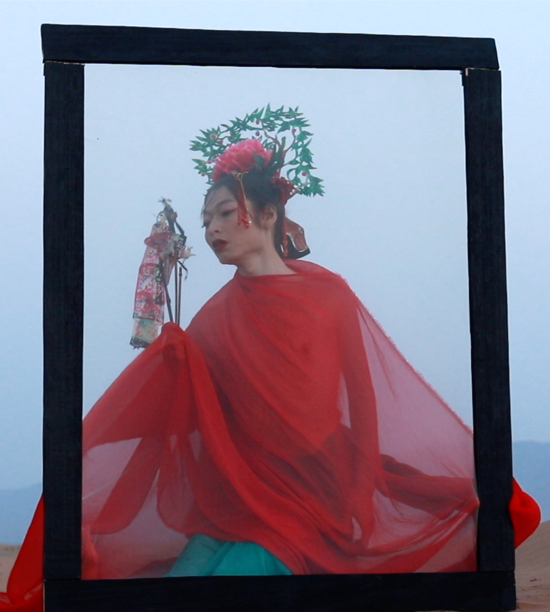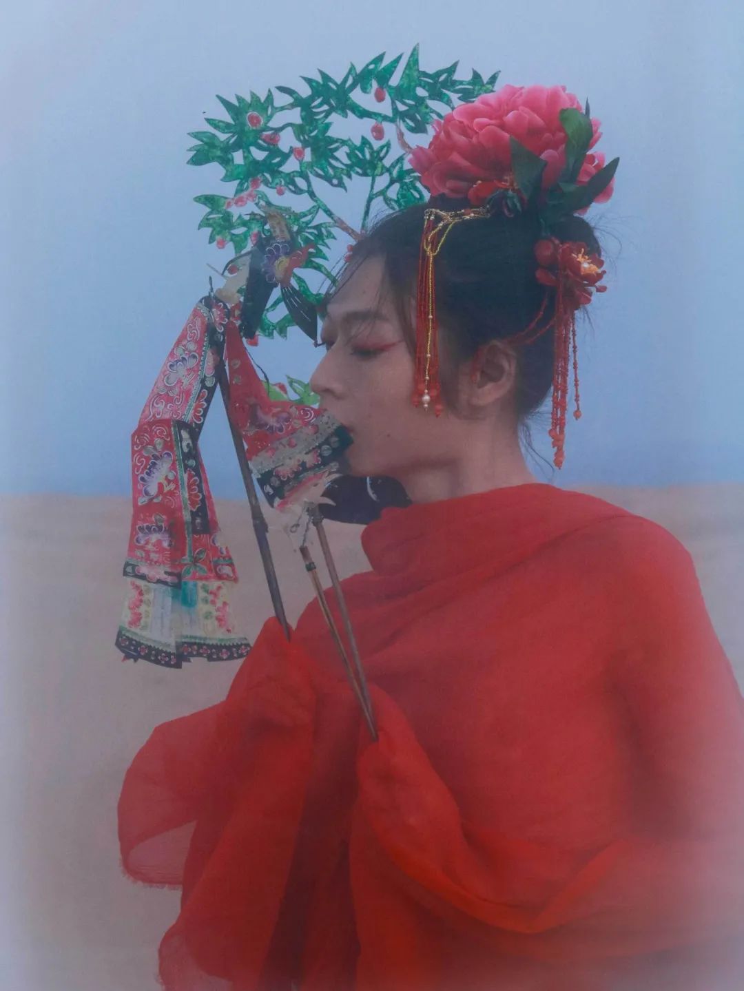 一袭红裙头戴红花的雯方,扮成了皮影造型