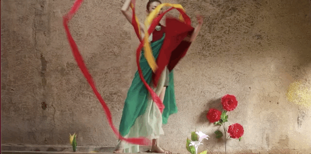 “敦煌”那一期,服饰就是从土屋旁边捡的各色破布条,红的绿的黄的,他把它们披挂在身上以后扬起来,就真的有了敦煌飞天的神韵。