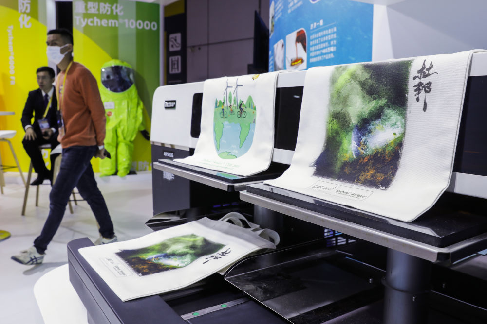 11月5日拍摄的能源低碳及环保技术专区杜邦展台上用环保墨水印制的环保袋。第四届中国国际进口博览会技术装备展区新设能源低碳及环保技术专区,展现低碳化、智能化等行业发展新趋势。(新华社记者张玉薇摄)