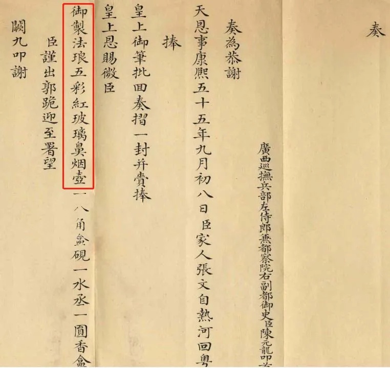 我们从康熙五十五年的这封奏折上可以看到,此时已经烧造出玻璃胎画珐琅,所以我们也可以确定,此时铜胎画珐琅也已趋成熟。