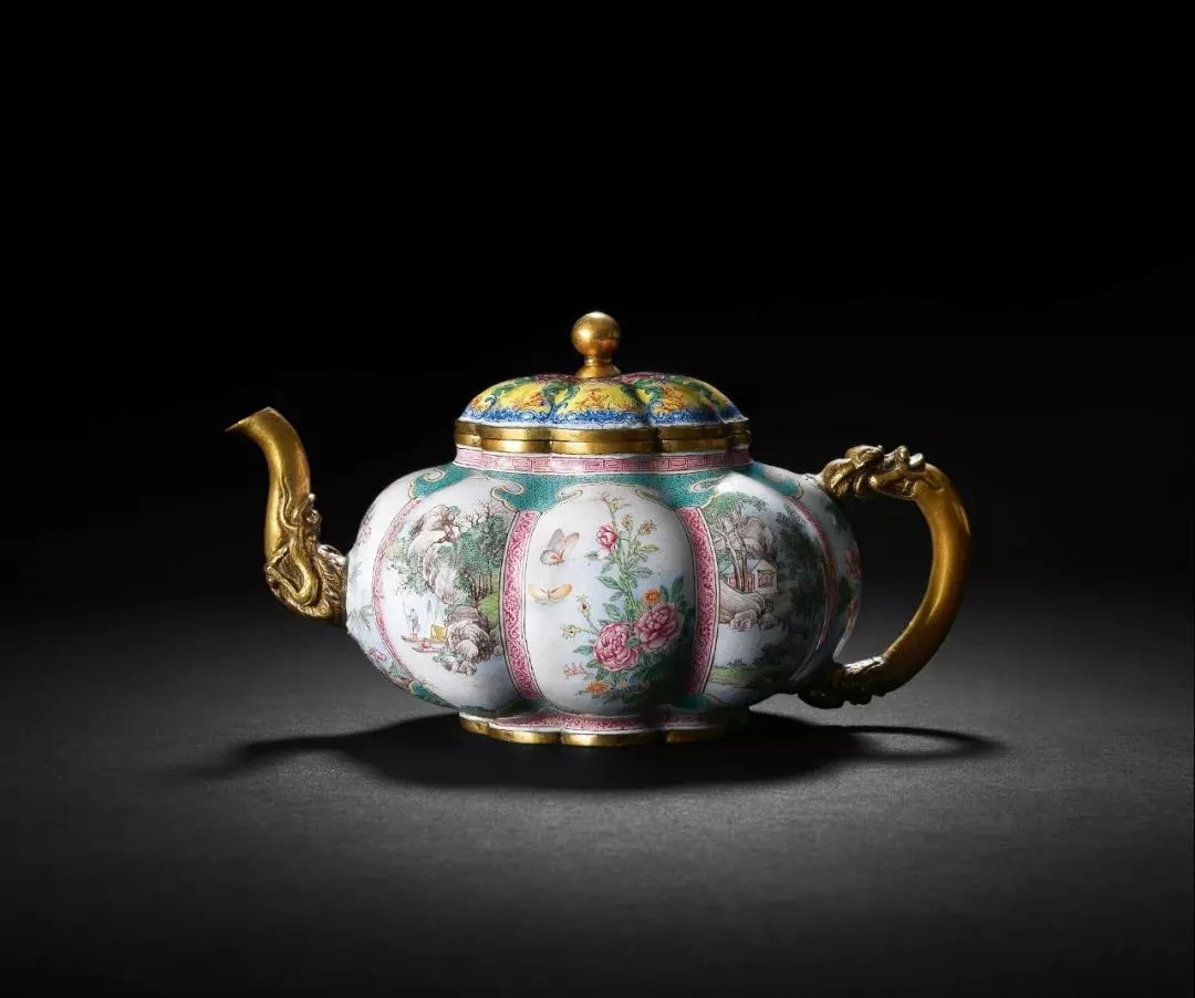 物以稀为贵一直是艺术品不变的原则,据查,此类乾隆瓜棱式壶已知仅三件,此为其中之一。其次就是品种——铜胎画珐琅成就了它的高贵。