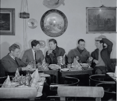 (从左到右)蒂莫西·贝伦斯、卢西安·弗洛伊德、弗朗西斯·培根、弗兰克·奥尔巴赫与迈克尔·安德鲁斯在伦敦苏豪区的惠勒饭店,1963年。(内页翻拍)