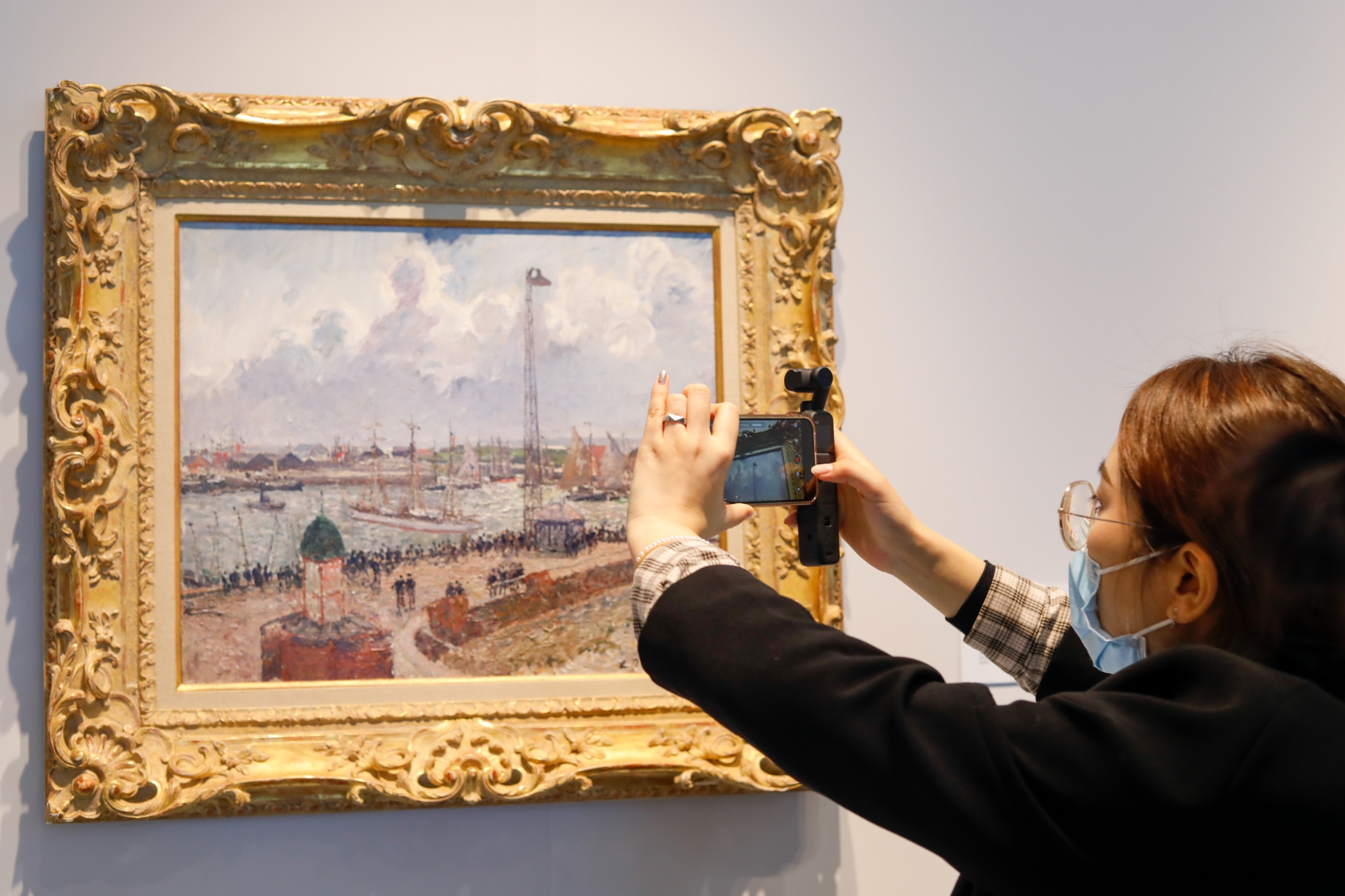 一位观众正在拍摄卡密尔·毕沙罗《勒阿佛尔的飞行员码头》。