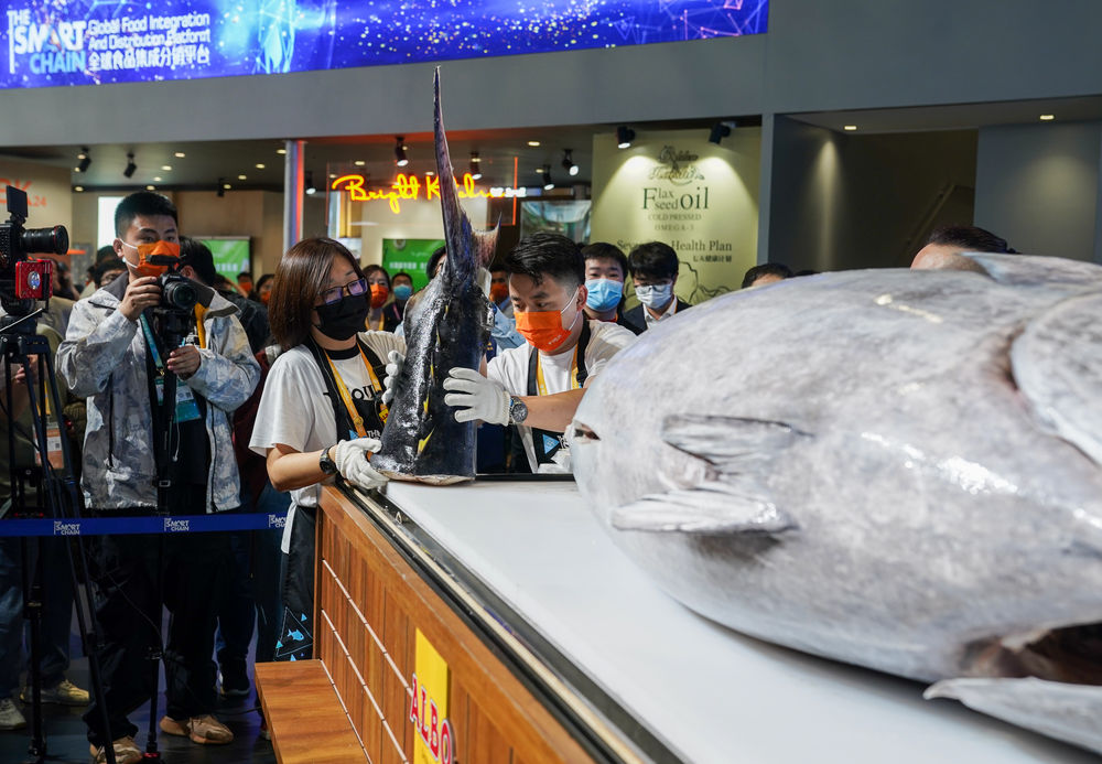 11月6日,工作人员在第四届进博会食品及农产品展区现场开鱼。新华社记者 邬惠我 摄