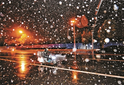 今年下半年最强寒潮带来了北京初雪。从昨天下午开始,北京全市先后经历了雨雪转换,终于在夜间迎来了今冬第一场降雪。市气象台表示,6日20时城区积雪深度1厘米左右,最大出现在延庆佛爷顶,达9厘米。北京青年报记者了解到,今冬北京第一场雪比常年提前了23天。图为昨晚,来广营红军营南路,快递小哥雪中送货。 摄影/本报记者 郝羿