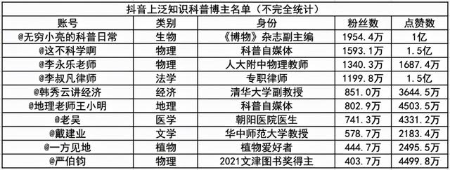短视频科普账号的破圈,也意味着有更多的人愿意去了解科学。如今,一批抖音泛知识科普博主深受网友喜爱。这其中,有人大附中物理教师@李永乐老师,粉丝数达1340.3万;有科普自媒体@这不科学啊,粉丝量达1593.1万;有专职律师@李叔凡律师,粉丝量达1199.8万;还有清华大学副教授韩秀云,获得3600多万点赞。