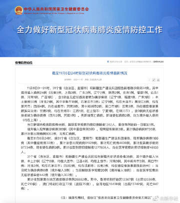 截至11月6日24时,据31个省(自治区、直辖市)和新疆生产建设兵团报告,现有确诊病例1169例(其中重症病例32例),累计治愈出院病例91929例,累计死亡病例4636例,累计报告确诊病例97734例,现有疑似病例3例。累计追踪到密切接触者1277806人,尚在医学观察的密切接触者48133人。