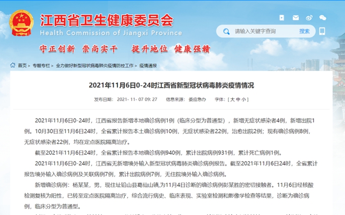 2021年11月6日0-24时江西省新型冠状病毒肺炎疫情情况