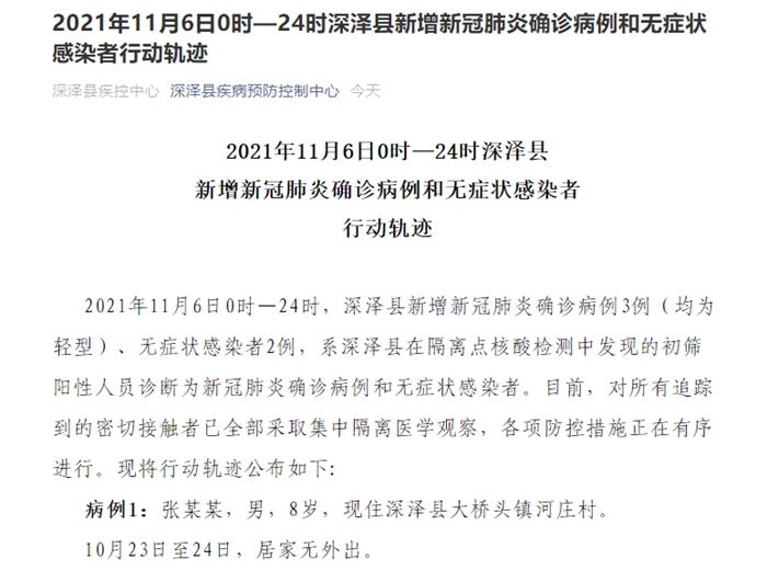 2021年11月6日0时—24时,深泽县新增新冠肺炎确诊病例3例(均为轻型)、无症状感染者2例,系深泽县在隔离点核酸检测中发现的初筛阳性人员诊断为新冠肺炎确诊病例和无症状感染者。目前,对所有追踪到的密切接触者已全部采取集中隔离医学观察,各项防控措施正在有序进行。现将行动轨迹公布如下: