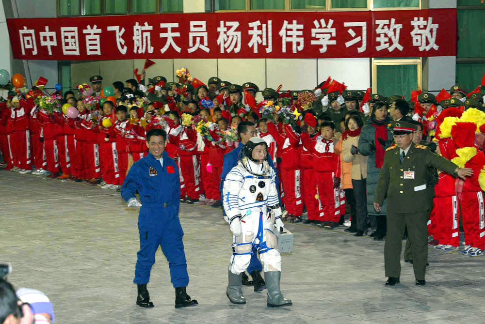 2003年10月15日,执行中国首次载人航天飞行任务的航天员杨利伟出发准备登舱。新华社记者李刚摄