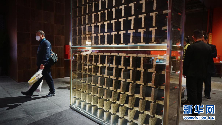 2021年11月6日,第四届中国国际进口博览会赤壁青砖茶国际体验馆内的青砖茶墙。新华网发