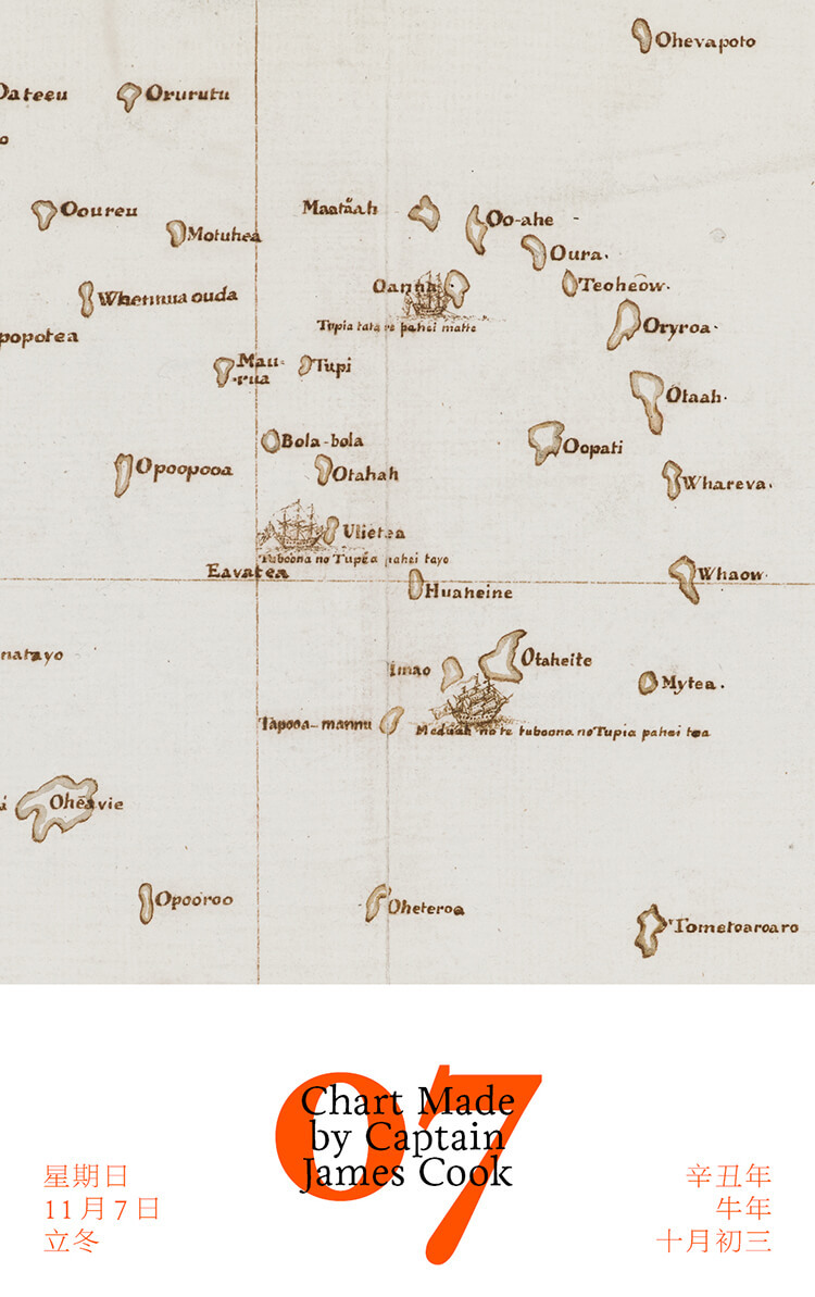 这幅航海图名叫《岛屿之间》,绘制于库克船长第一次远航期间。它详细标注了以塔希提岛为中心的“社会群岛“,东到马克萨斯群岛,西到斐济,展现了5000平方公里范围内的所有岛屿。