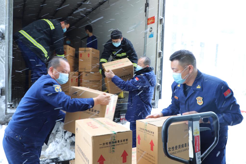 辛集市消防大队队员冒着风雪搬运防疫物资。(受访单位供图)