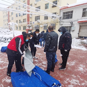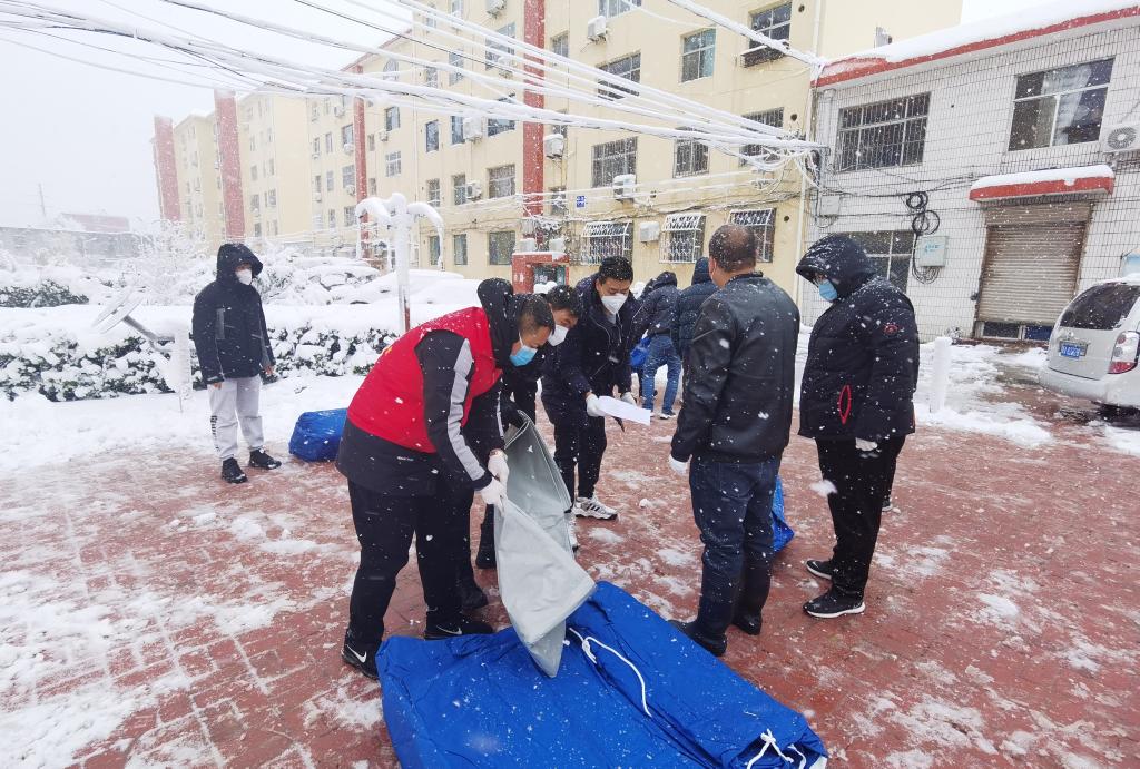7日,河北省辛集市鹿城社区居民和工作人员一起清理积雪,搭建开展核酸检测使用的帐篷。(辛集市委宣传部供图)