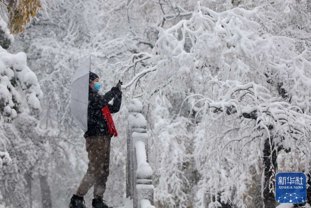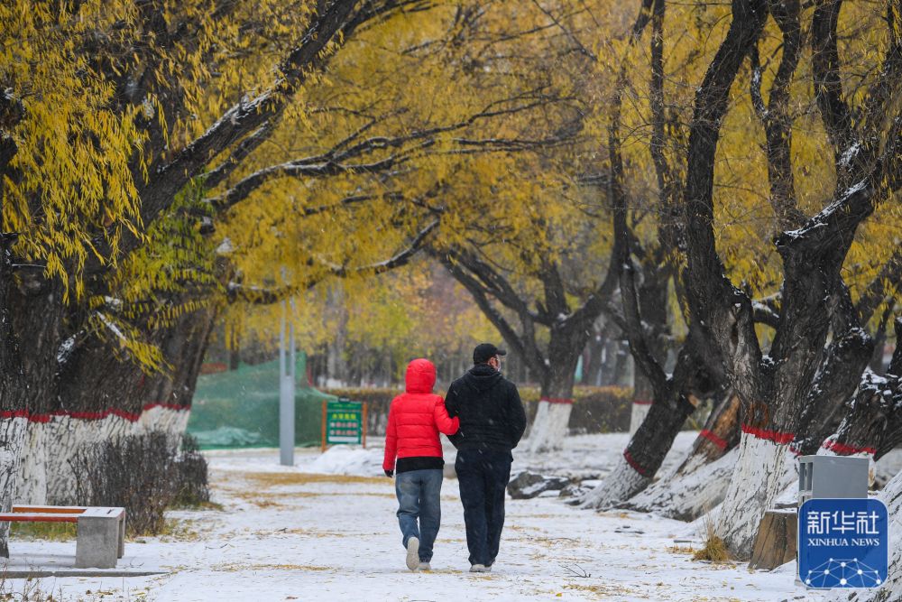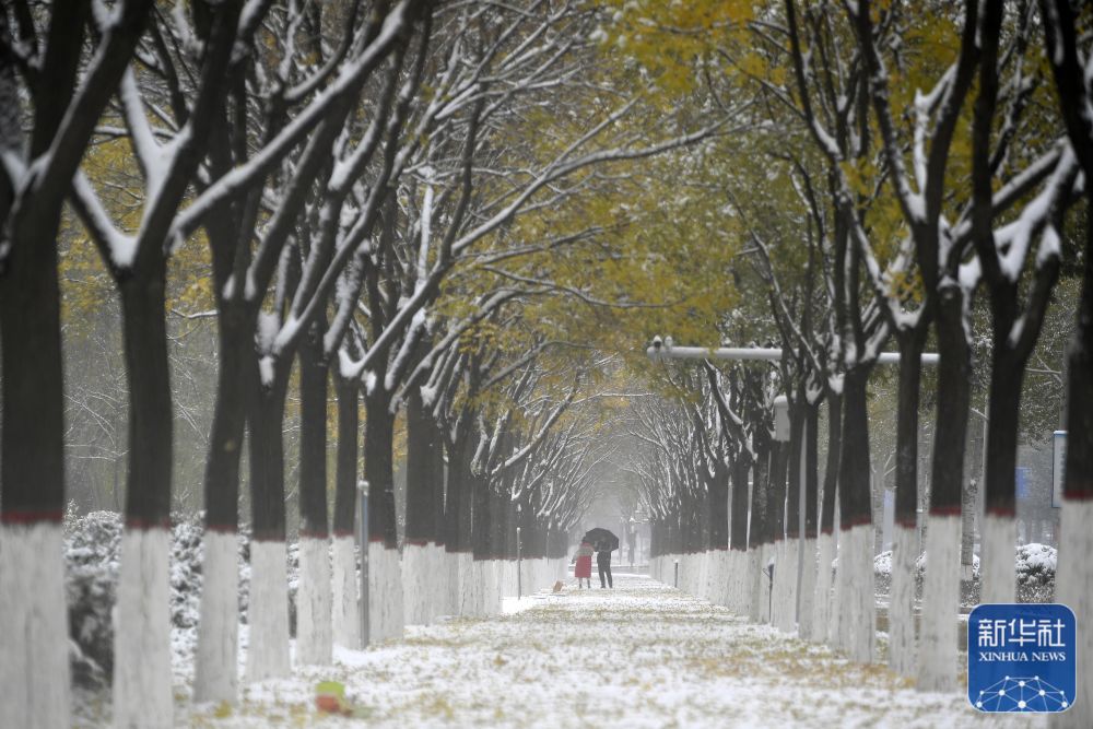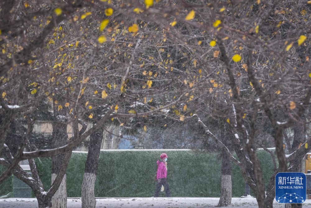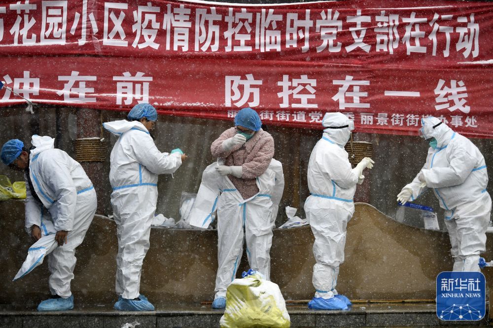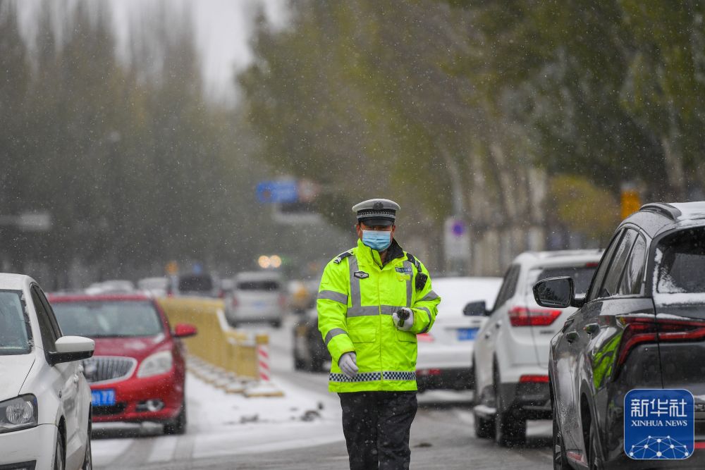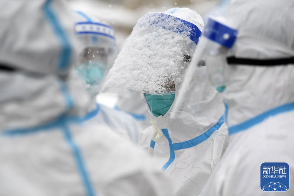 △11月6日,在宁夏银川市兴庆区一处中风险小区门前,前来支援的医务人员在风雪中等候分配任务。