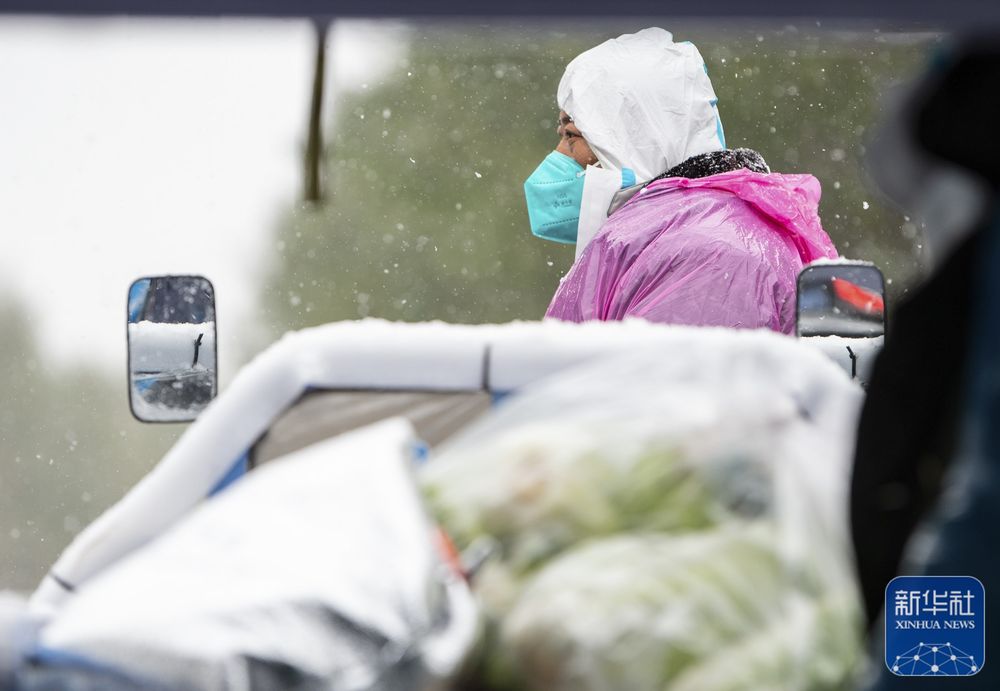 △11月7日,在处于封控管理下的北京市昌平区天通北苑第二社区,工作人员冒雪运送物资。