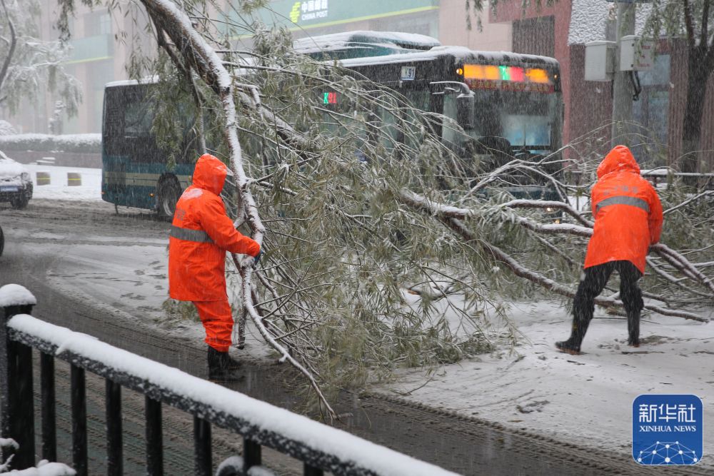 △11月7日,环卫工人在山东省济南市黑虎泉西路上清理断裂的树枝。