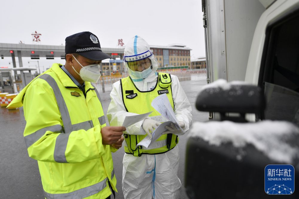 △11月6日,宁夏银川市兴庆区交警一大队协警(右)与高速公路工作人员在高速公路收费站对过往车辆进行检查。