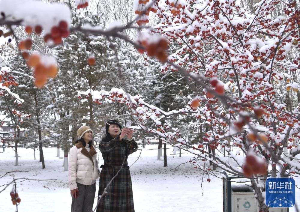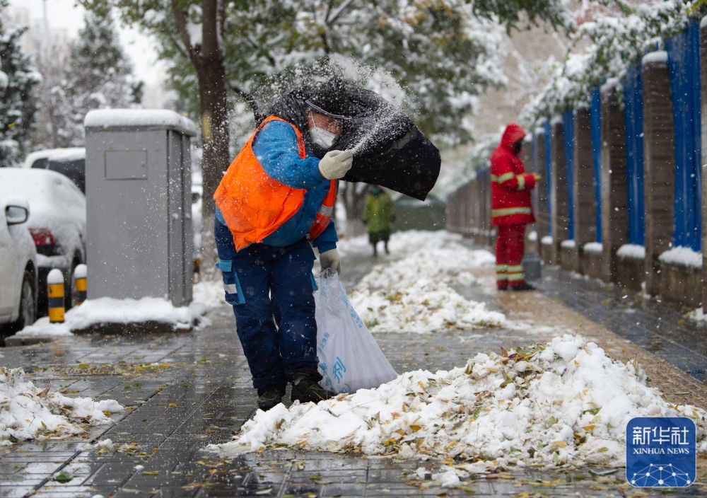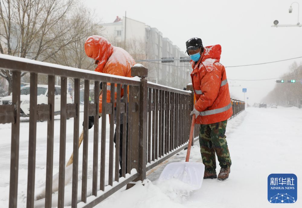 △11月6日,康保县的环卫工人在清理县城路面上的积雪。