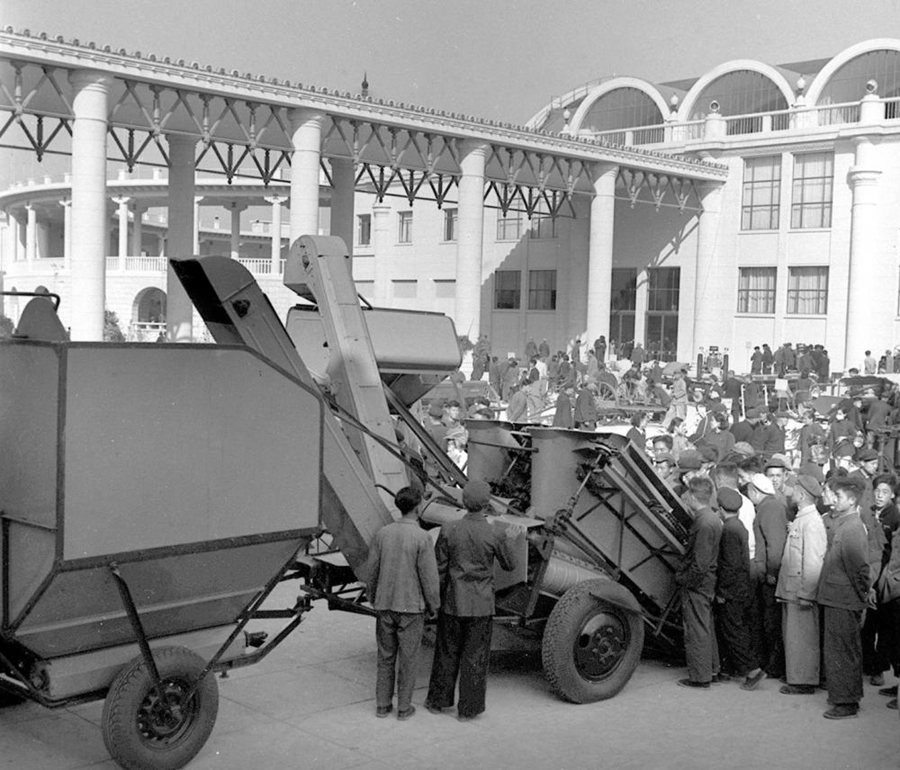 1954年,苏联经济及文化建设成就展览会在北京举行。展会上展出的联合收割机,吸引了大批观众。新华社记者 谈培章 摄