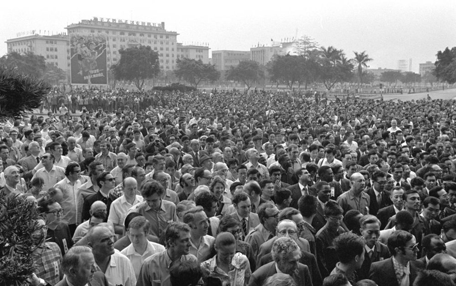 1973年,春季中国出口商品交易会在广州举行,来自世界各地的客商聚集在交易会大楼前。新华社发