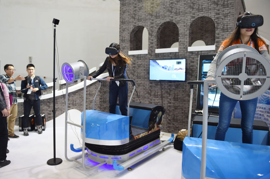 2016年10月19日,国际冬季运动(北京)博览会开幕。这是参观者在博览会上的虚拟现实设备体验滑雪。新华社记者 鞠焕宗 摄