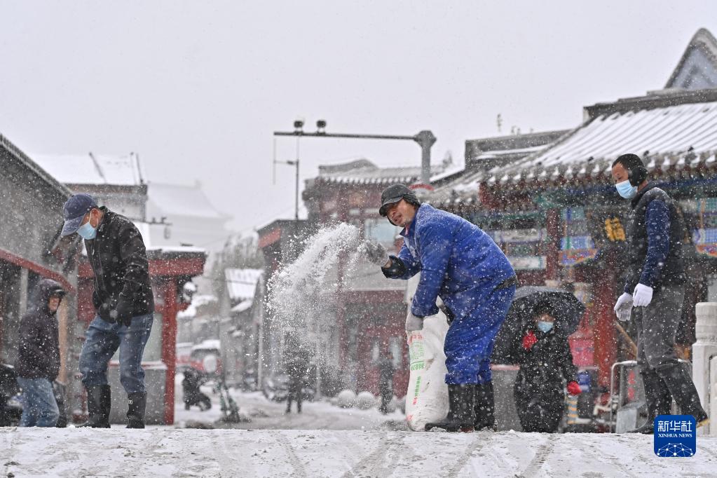 11月7日,什刹海保洁队工作人员在银锭桥上撒融雪剂。新华社记者 李鑫 摄
