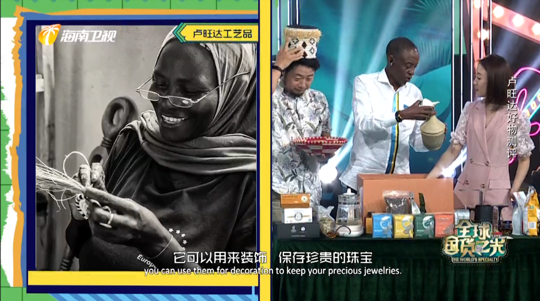 ▲肯尼亚驻华商务参赞介绍并冲泡红茶正如卢旺达驻华大使詹姆斯·基莫尼奥在节目中自信地说道,“卢旺达拥有多个品牌的咖啡,KiNUNU、Mosongo、Gorillas……拥有类型众多的好茶,绿茶、红茶、白茶、有机茶、香料茶等,它们都已在中国市场找到了自己的定位。”大使先生第二次做客《全球国货之光》更多的为大家推广了卢旺达的文化和艺术。精美又独具非洲元素的手工艺品,不仅具有广泛的实用性,而且是舞蹈创作中必不可少的道具之一。大使先生带来的惊喜盲盒,更是将整场节目的氛围推向高潮。现场试穿传统服饰,伴着大使先生亲自配乐的非洲鼓点,与卢旺达舞蹈演员一同载歌载舞,岂不快哉!“我感觉我已经在卢旺达!”小嘉宾兰西雅喊出了现场所有人的心声。