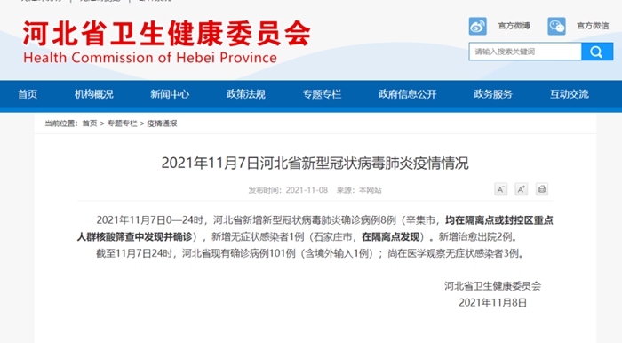 2021年11月7日0—24时,河北省新增新型冠状病毒肺炎确诊病例8例(辛集市,均在隔离点或封控区重点人群核酸筛查中发现并确诊),新增无症状感染者1例(石家庄市,在隔离点发现)。新增治愈出院2例。