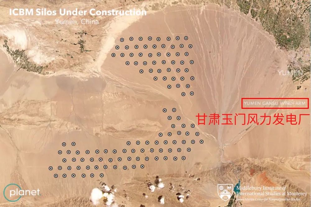实际上,这些报道刚刚发出,就立刻遭到“打脸”。很多人发现,这些所谓“发射井”的旁边,清楚写着“甘肃玉门风力发电厂(YUMEN GANSU WINDFARM)”的英文文字水印。甚至有人放大这一地点的卫星图片后,一排排风力发电塔和地上的影子都清晰可见。