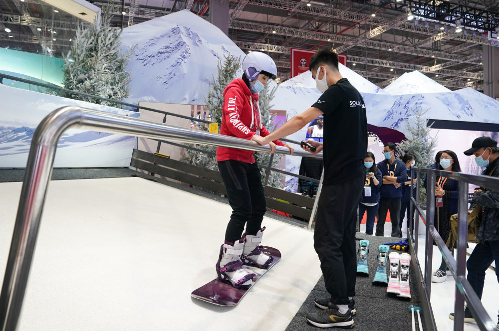 参观者在进博会消费品展区的一家展台体验滑雪。新华社记者丁汀摄