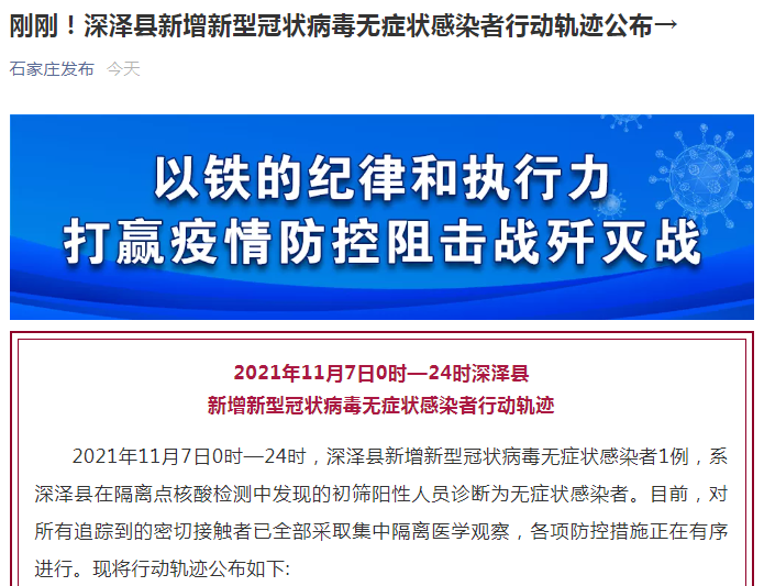 2021年11月7日0时—24时,深泽县新增新型冠状病毒无症状感染者1例,系深泽县在隔离点核酸检测中发现的初筛阳性人员诊断为无症状感染者。目前,对所有追踪到的密切接触者已全部采取集中隔离医学观察,各项防控措施正在有序进行。现将行动轨迹公布如下: