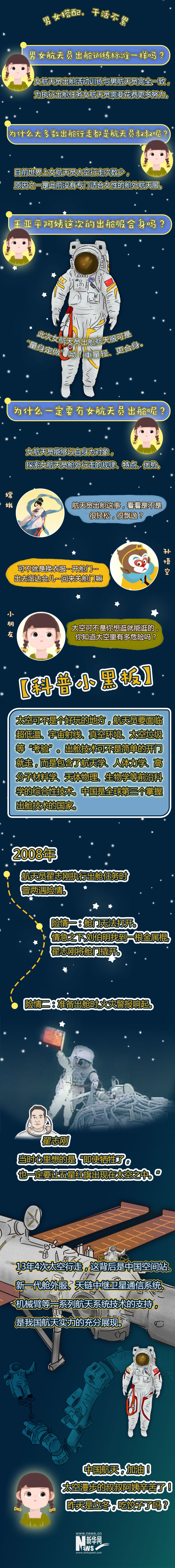 自古神话有嫦娥奔月、女娲补天、神女飞天,中国人从未停下“飞天”的梦想。昨天,答应为女儿“摘星星”的王亚平成为中国首位实施出舱活动的女航天员,迈出了中国女性舱外太空行走第一步。13年来,中国航天员已经完成了4次太空行走。出舱后他们分别做了啥?“感觉良好”是个啥感觉?看完你就有感觉了。