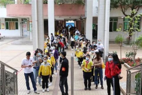 广东省佛山市南海区西樵镇第二小学,学生们正在排队等待接种新冠疫苗。佛山市南海区第四人民医院供图