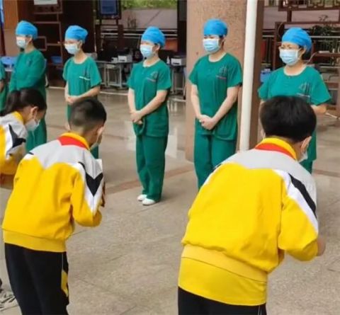 11月3日,佛山市南海区第四人民医院的医护人员接种完上午场疫苗后,南海区西樵第二小学的学生们在老师带领下,利用午休的时间,向现场医护人员鞠躬感谢,并深情演唱歌曲《有你就幸福》。