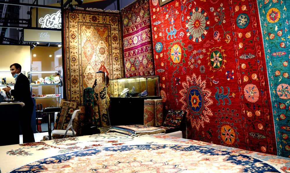 11月6日在第四届进博会上拍摄的阿富汗手工羊毛地毯展台。(新华社记者张建松摄)