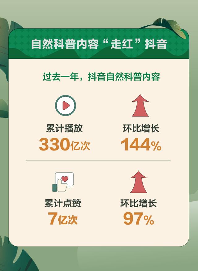 11月8日,抖音发布《2021抖音自然科普内容数据报告》。报告显示,过去一年抖音自然科普类视频累计播放近330亿次,7亿人次为相关作品点赞,短视频成为自然科普内容的重要传播形式。