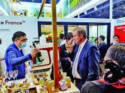 法国大使罗梁正在法国食品和农产品展台品尝美酒。本报记者 邹晓菁摄/光明图片