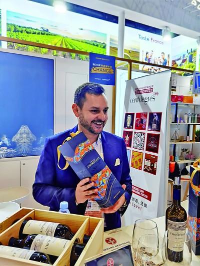 法国参展商奥斯卡正在向观众介绍他今年带来的葡萄酒包装。本报记者 邹晓菁摄/光明图片