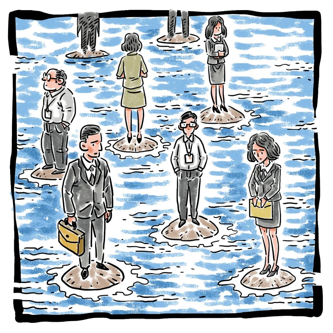国外有人创作了一幅画:宽阔无边的海洋中间,无数西装革履或职业裙装的男女,脚下只有一小块仅能容足的陆地,彼此互不相连。隐喻职场中的人际关系,即梭罗所说的“廉价社交”,表面看结合紧密,实际上每个人都是一个贫瘠的孤岛。