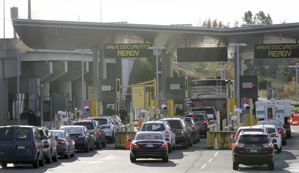 11月8日,在加拿大萨里的加美边境,车辆排队准备驶入美国。(新华社发,梁森摄)