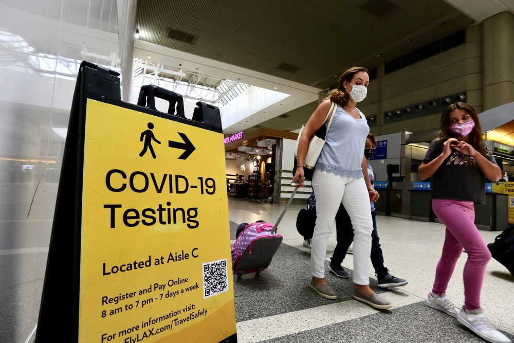 7月18日,佩戴口罩的旅客走过美国洛杉矶国际机场内的一块新冠检测告示牌。(新华社发)