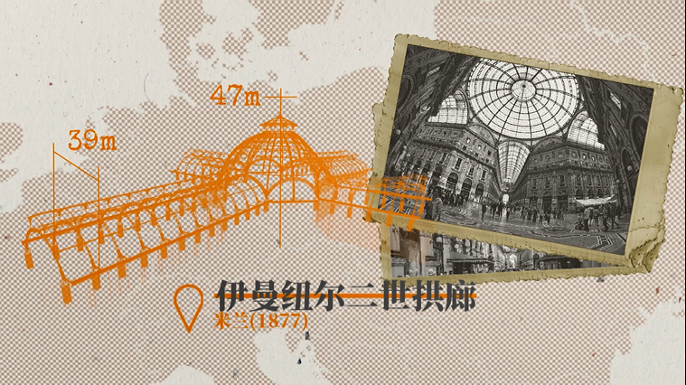 以米兰的伊曼纽尔二世拱廊为例,它同样用玻璃和铁结构建成,街道宽39米、玻璃穹顶高度近47米,令下方的购物商店沐浴在消费文明的梦幻光线中。