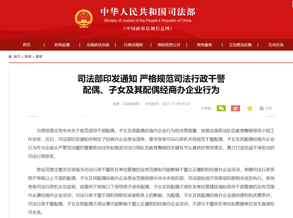 司法部:规范司法行政干警配偶、子女及其配偶经商办企业行为