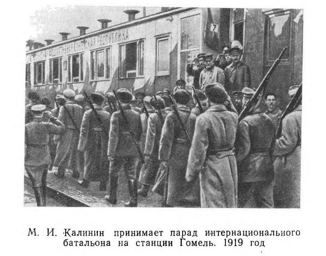 1919年,苏俄领导人加里宁在戈麦尔火车站检阅国际部队